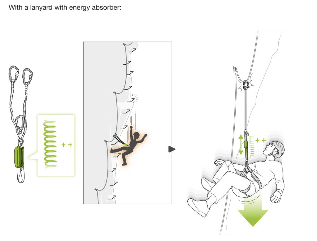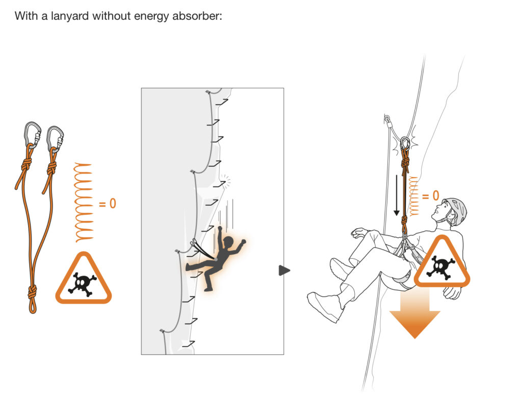 See the illustrations from Petzl below the video. When moving UP on a via ferrata, there is a risk of fall factor greater than 2, in which case you need to have a lanyard that provides for energy absorption.