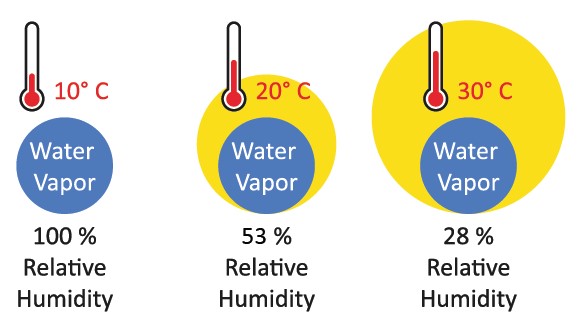 Relative humidity refers to how much moisture is in the air relative to that air’s capacity. Capacity is based on air temperature. The warmer the air, the greater its capacity to hold moisture. When you understand relative humidity and dew point (and a few other topics contained in this knowledge base) you are in a better position to predict changes in weather.