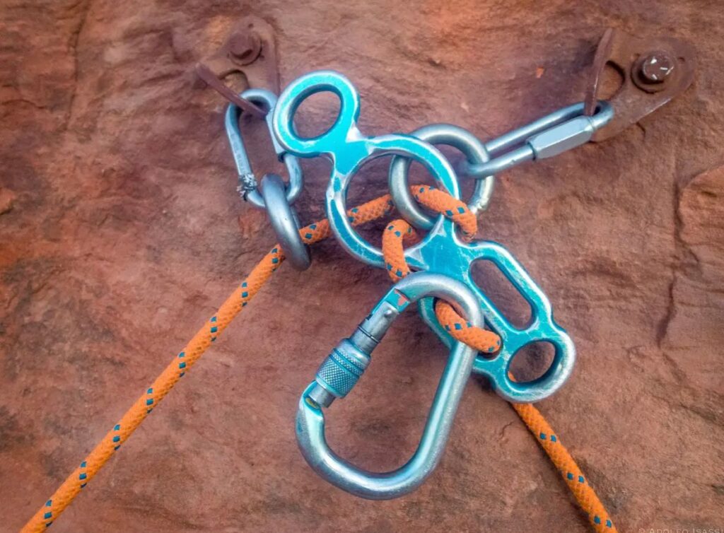 With releasable blocks, you still need the same three parts, but unlike the MMO, blocks can create another potential safety issue — stemming from the possibility that someone could rappel on the wrong strand of rope. So keep that in mind when you are asking yourself what you need to do for the safety in step #3.