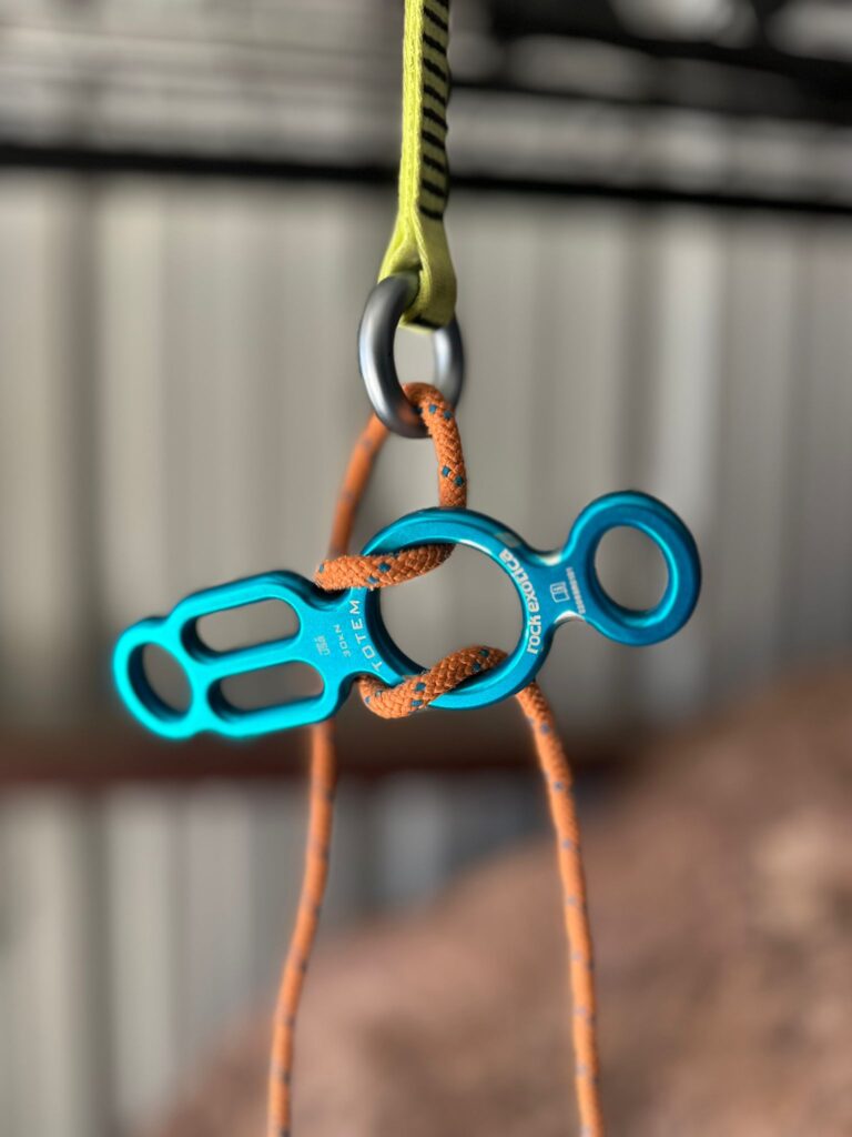 If the rope came off the “neck” of the Totem while someone is on the rappel side, the rope could slip. That issue could be addressed by clipping a carabiner into the small hole of the Totem and also on the brake strand to create a closed system.