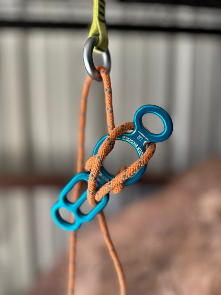 Friction is created by the rope passing around the long end of the Totem. Because it is a block, it is rigged on the “back” side of the rappel ring. In this photo, the rappel strand of the rope is on the left. The rope on the right is the brake strand.